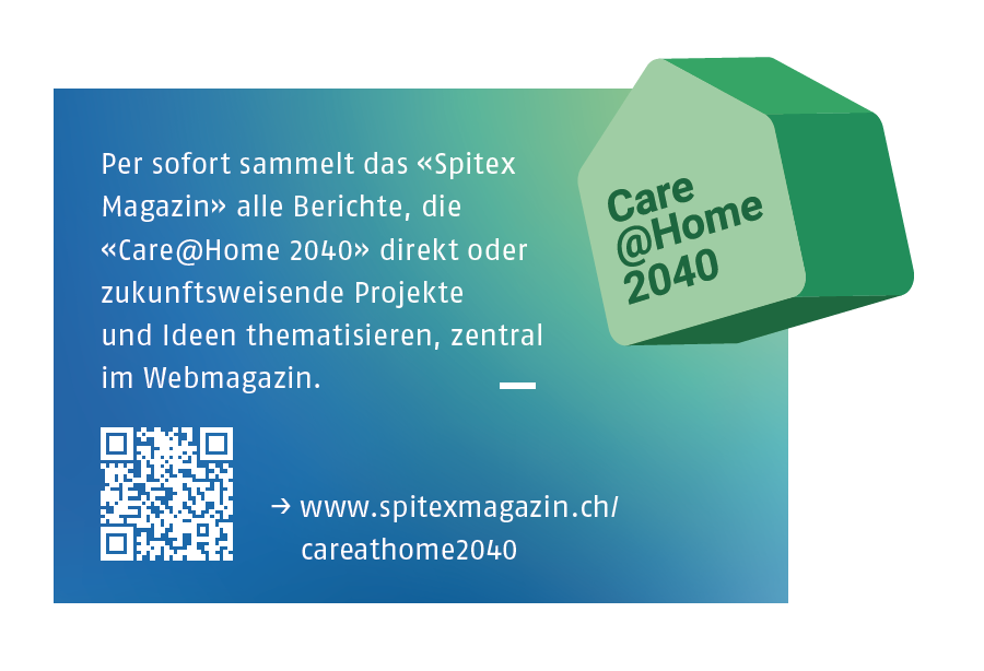 Care@Home 2040: Spitex Schweiz schärft derzeit das Zukunftsbild «Care@Home 2040». 2040 wird betrachtet, weil dies unter anderem auch die «Agenda Grundversorgung» des Bundes tut. Care@Home 2040 beschreibt eine integrierte Gesundheitsversorgung zu Hause im Jahr 2040, die alle gesundheitsbezogenen Leistungen für die unterschiedlichsten Klientinnen und Klienten umfasst. Diese werden von einem gut koordinierten, digital verbundenen Netzwerk aus professionellen Leistungserbringern erbracht, wobei die Spitex eine zentrale Rolle spielt.