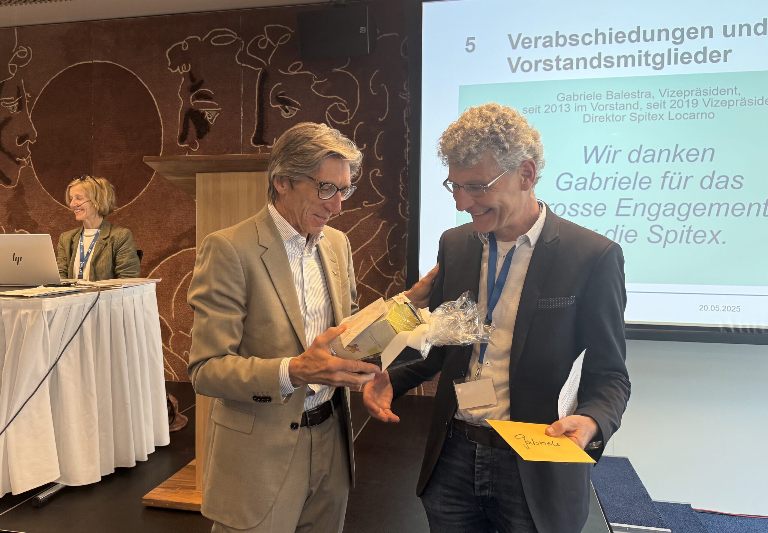 Thomas Heiniger (links), Präsident von Spitex Schweiz, verabschiedete erst Gabriele Balestra als Vorstandsmitglied und Vizepräsident.