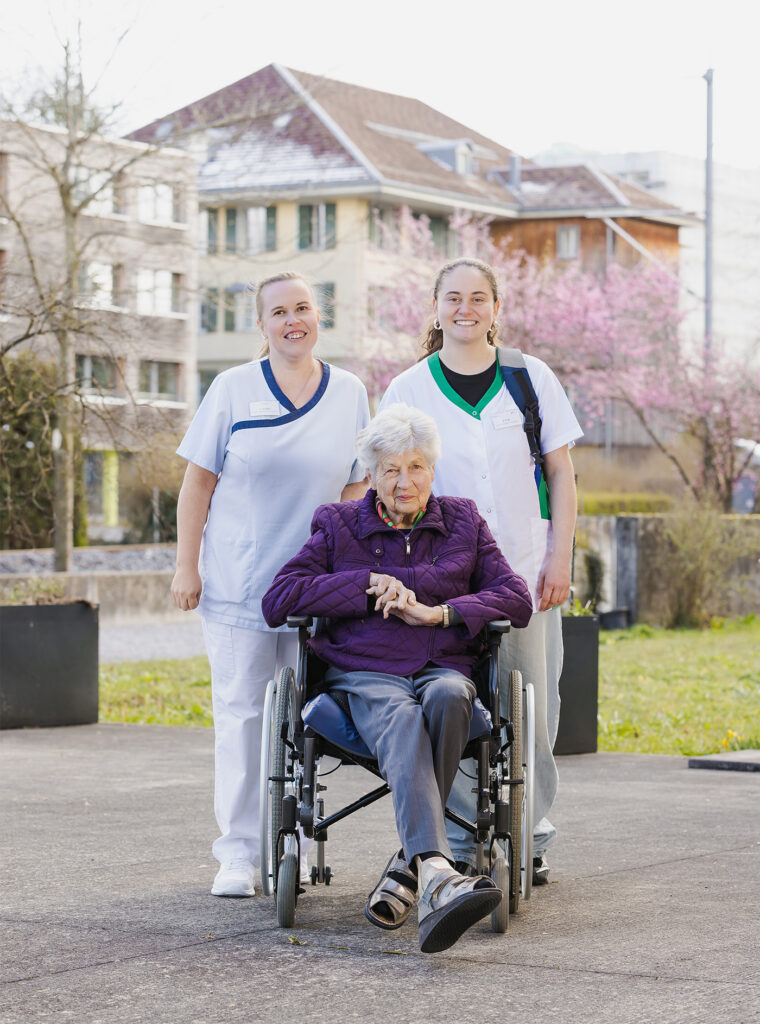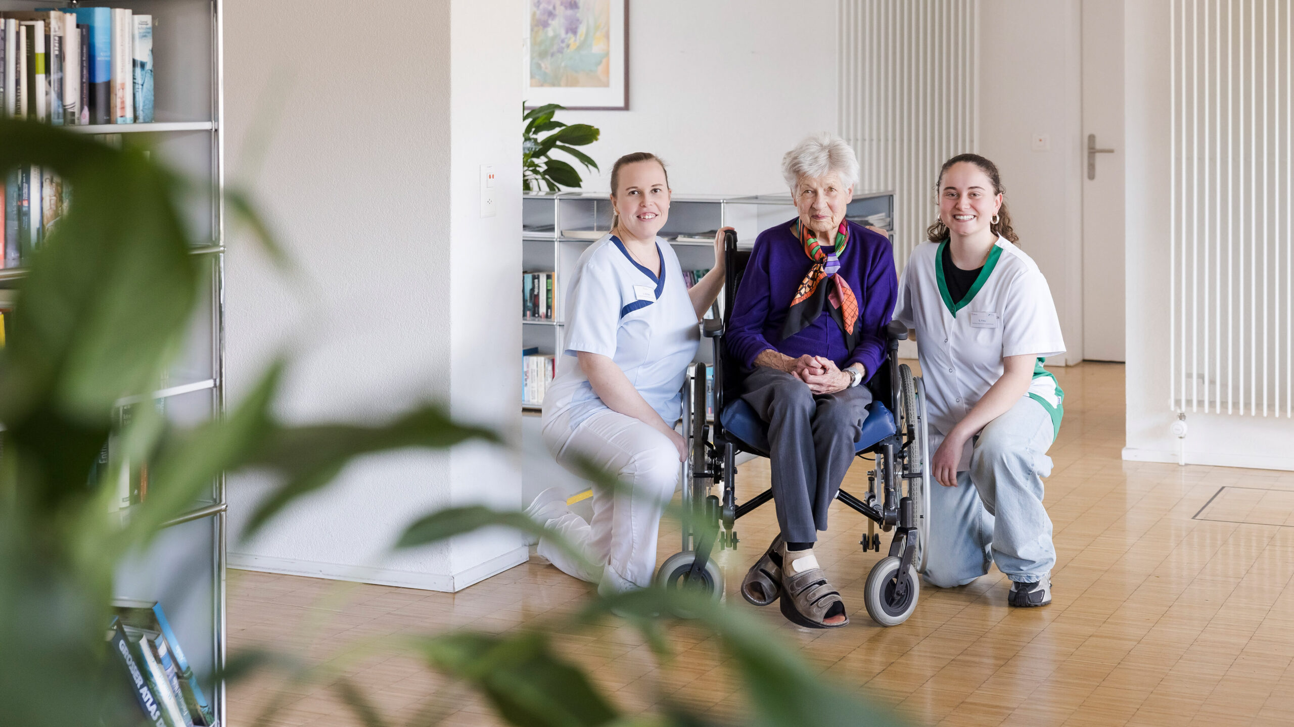 Dans le cadre du dossier «ASD et EMS», Lisa Greber (g.), collaboratrice en EMS, et Emma Frey (d.), collaboratrice de l’Aide et soins à domicile, toutes deux employées de careköniz (BE), posent avec leur cliente Erika Künzi. Photo: Mike Niederhauser