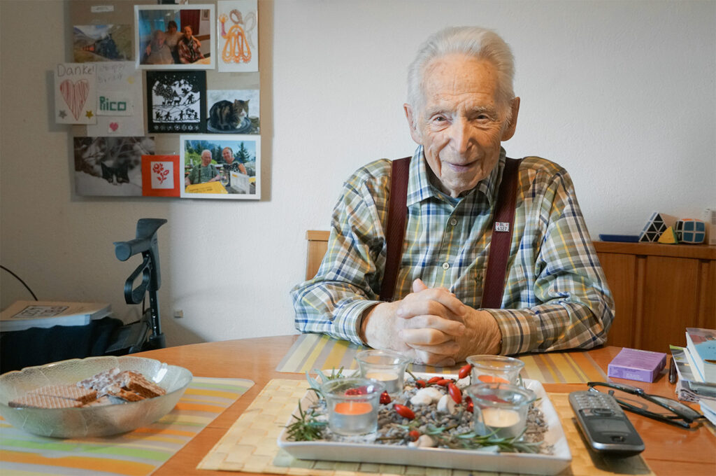 A 97 ans, Rico Dönz parvient à vivre seul dans sa maison grâce au soutien quotidien du service d’aide et de soins à domicile de Spitex Region Landquart et aux visites hebdomadaires de sa fille Andrea. Même pendant les fêtes, il savoure une vie autonome en compagnie de sa chatte Amira.
