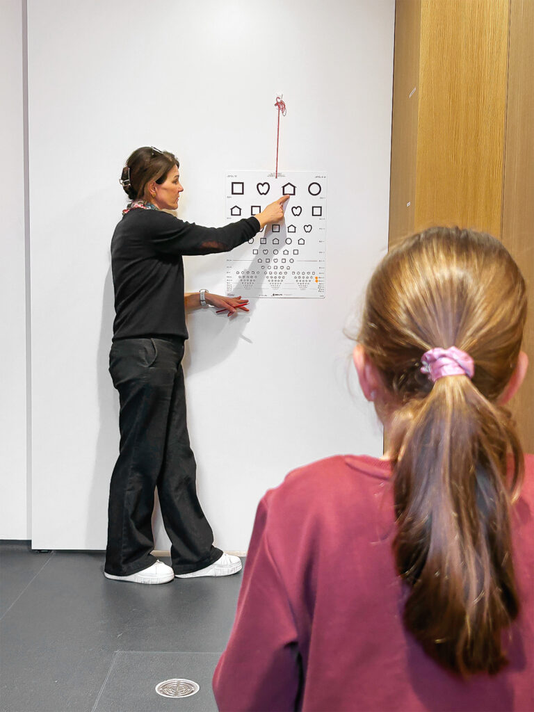 Cathrin Streich, infirmière au service d’aide et de soins à domicile de Kriens, teste l’acuité visuelle d’une élève. Photo: màd
