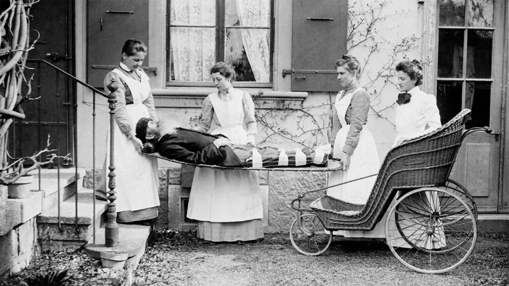 Transport d’un blessé par les élèves. Vers 1900. Photo: Archives Fondation La Source