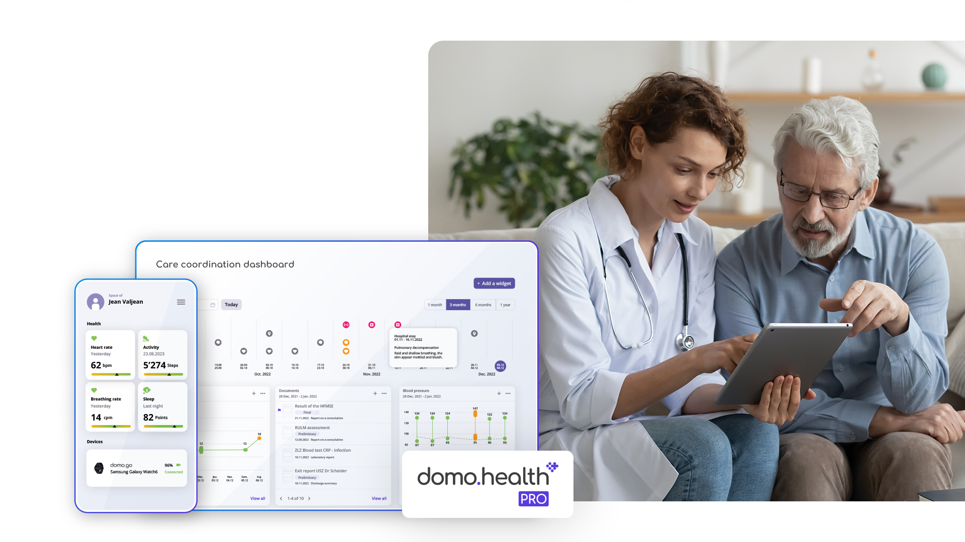 Die Plattform domo.health PRO fungiert als zentrales Cockpit mit einem 360°-Blick auf jede Patientin und jeden Patienten. Alle Informationen laufen zentral zusammen: klinische Daten, Pflegepläne, Warnmeldungen, Kommunikation zwischen Fachpersonen, administrative Abläufe, automatisierte Abrechnung und direkte Übermittlung an die Versicherungen. Das Ergebnis: weniger Routinearbeit und mehr Zeit für die Pflege von Menschen in einer bisher unerreichten Qualität.